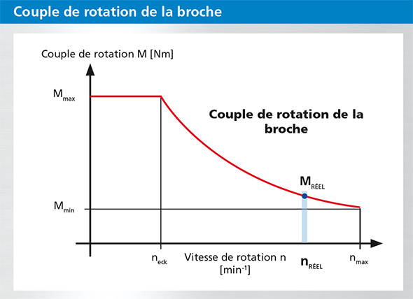- du couple de rotation réduit de la broche en cas de vitesse de rotation élevée