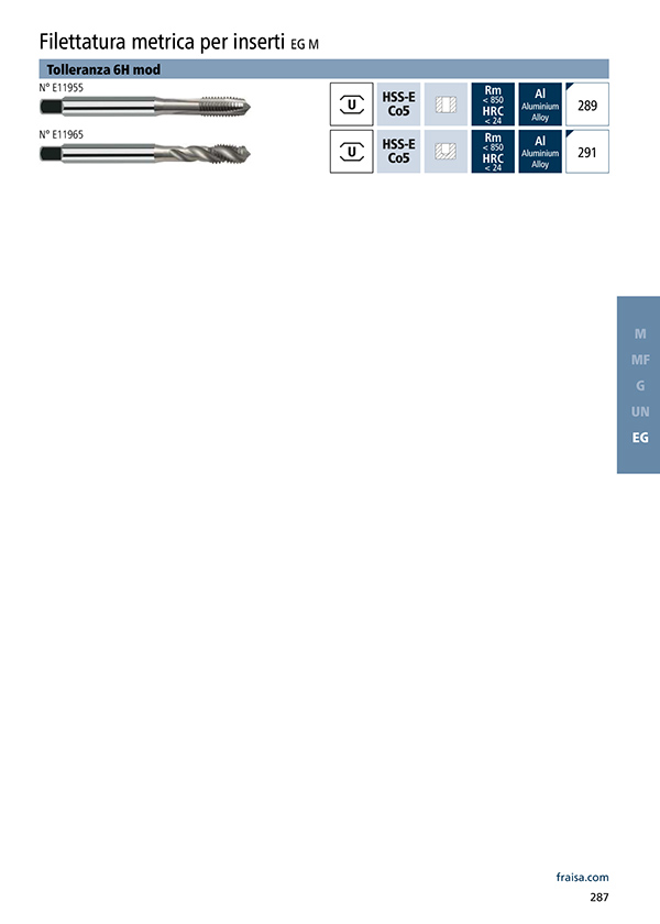 - Frese a filettare con smusso 45° M / MF / G / UNC / UNF